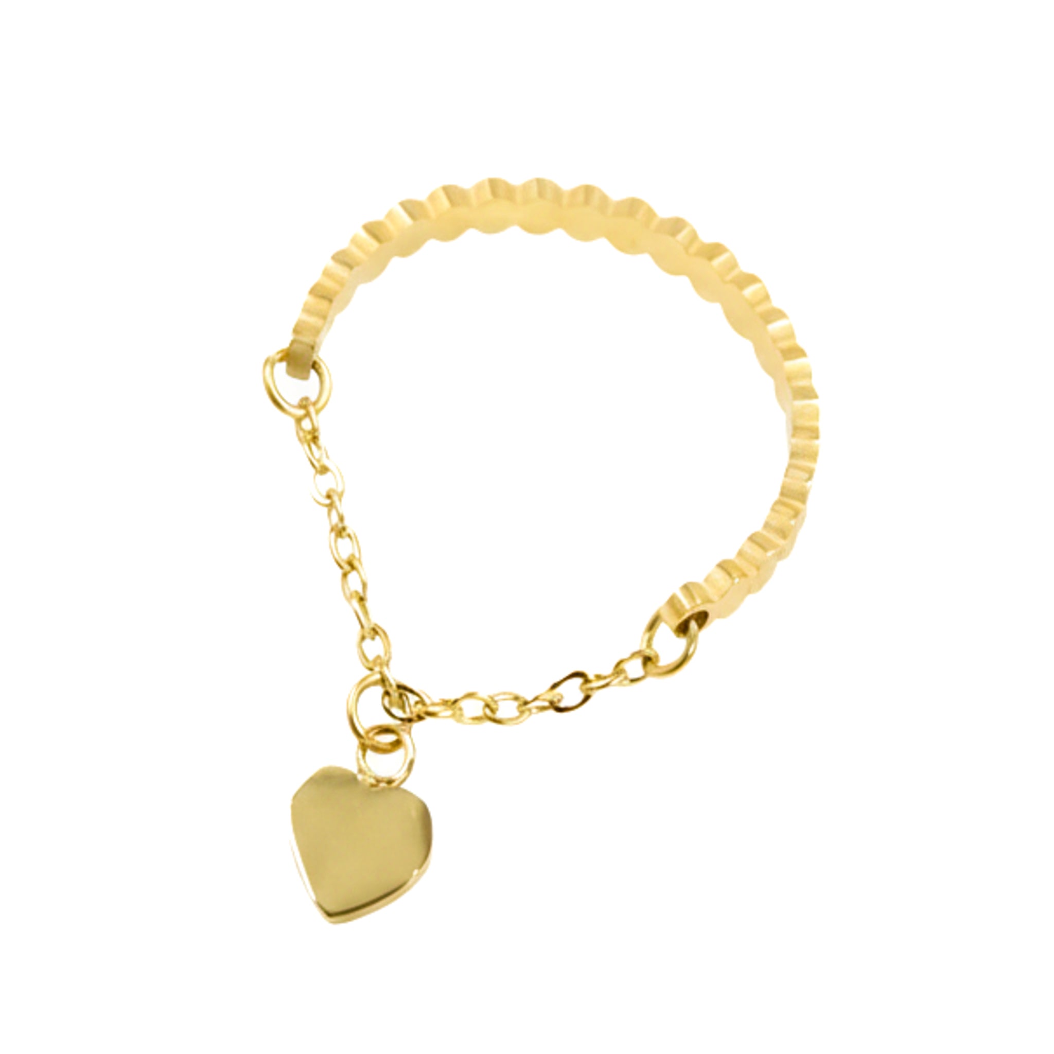 Son anneau texturé, légèrement ondulé, en acier inoxydable est relié à une fine chaîne d'où pend un petit cœur doré. Le pendentif bouge délicatement avec vous, apportant une touche de finesse et de romantisme à votre main.