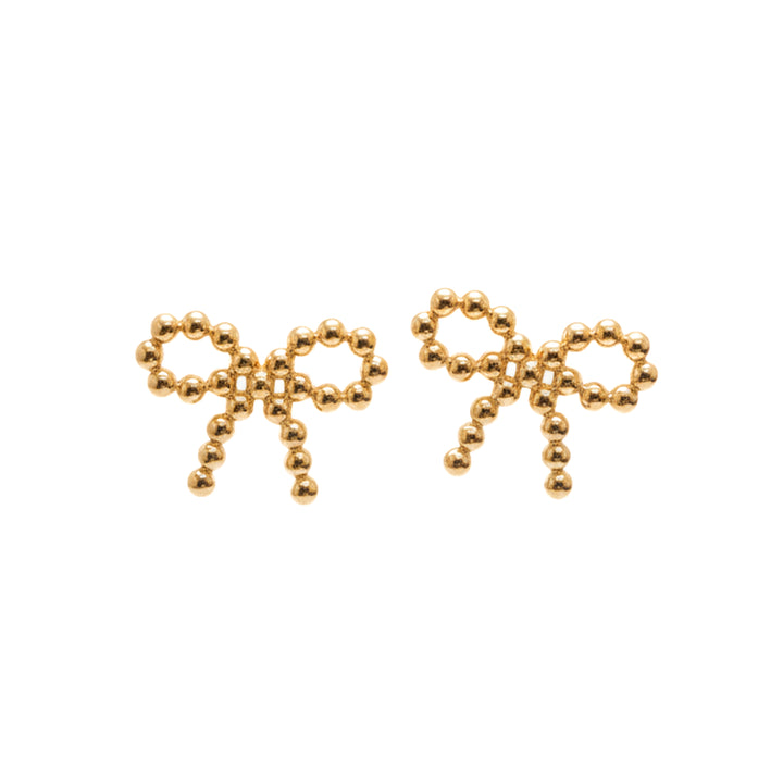 Ces puces d'oreilles super mignonnes en acier inoxydable reprennent la forme d'un joli nœud, entièrement réalisé avec de petites billes dorées. C'est le détail qu'il faut pour apporter une touche de féminité et de fantaisie à votre look.