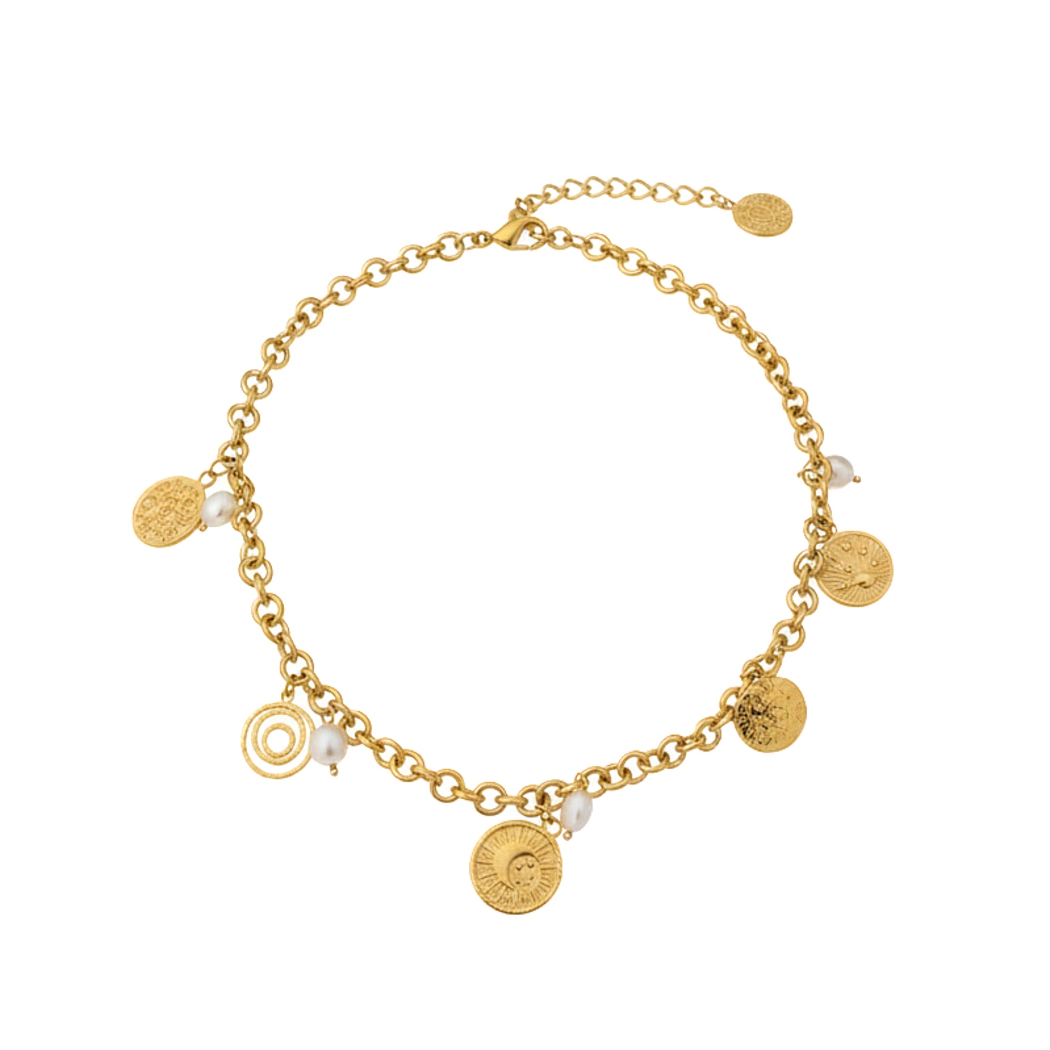 Ce collier tendance se distingue par sa chaîne épaisse dorée en acier inoxydable et ses nombreux charms : médaillons martelés, spirale graphique, et petites perles blanches douces. C'est le mix parfait entre force et féminité.