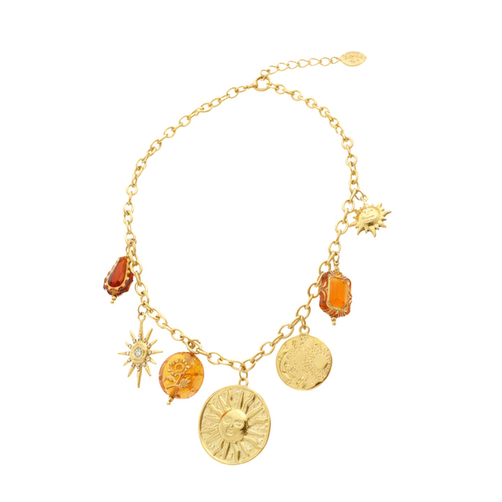 Sa chaîne dorée en acier inoxydable est une véritable galerie de trésors : un grand soleil rayonnant, des perles aux teintes chaudes ambrées, une étoile scintillante... C'est l'accessoire parfait pour un look bohème-chic et ensoleillé.